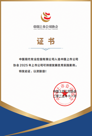 11月18日,中國上市公司協會正式發布《2025年中國上市公司可持續發展優秀實踐案例》。現代牧業(01117.HK)憑藉在智慧養殖數碼化創新與工藝廢氣深度治理方面的卓越成果,獲評「2025年上市公司可持續發展優秀實踐案例」。